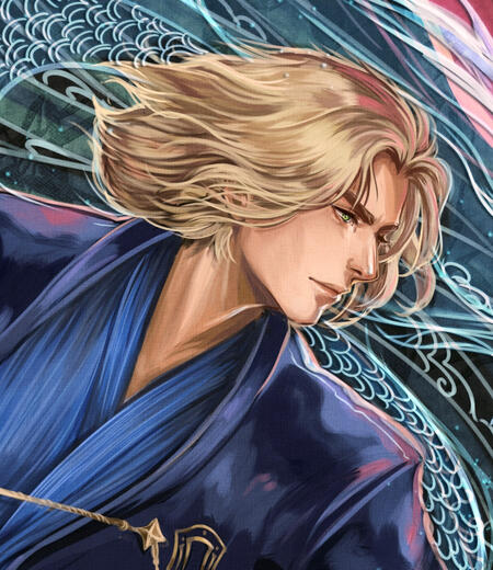 Roderick is a fair-skinned Hyur hailing from Limsa Lominsa. He has medium-length blonde hair parting in the middle that he keeps swept back on most days or tied up occasionally. The shape of his face is round, with his cheeks and jawline being slightly slimmer than the rest of his features. In contrast to his hair, Roderick has a pair of dark green eyes. With several years of adventuring under his belt, the Hyur has developed a toned and athletic build suited for the lifestyle.